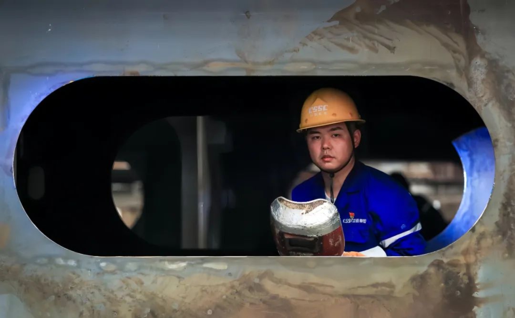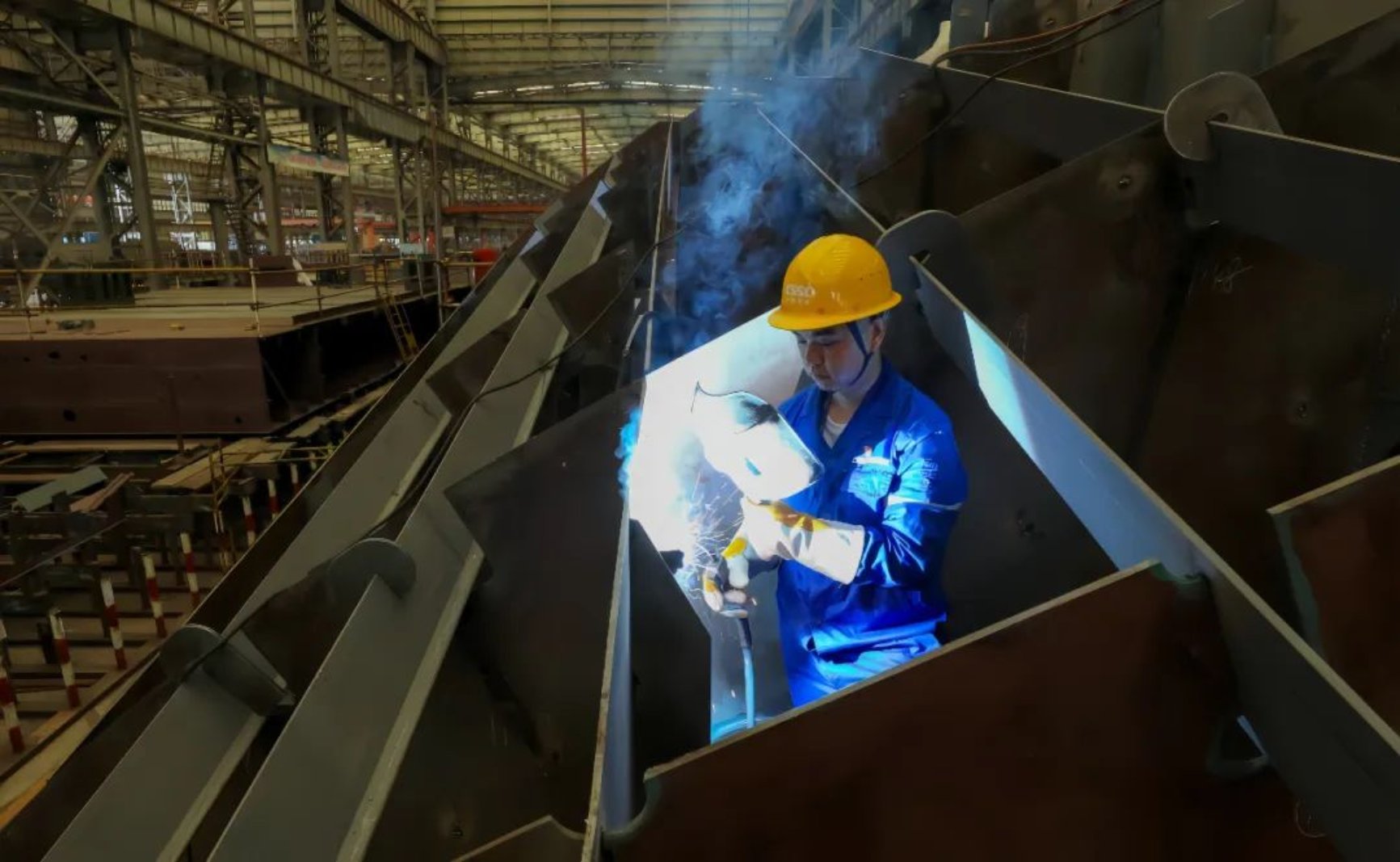 在船臺車間,總能看到一抹深藍色的身影手持焊槍半蹲半跪,焊接聲“嗞嗞”作響,白色焊煙騰起,焊絲和板件的連接處發出刺眼的光。