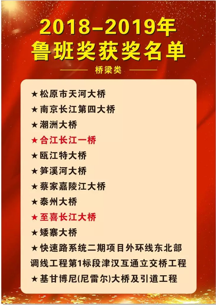 12月10日,建筑業(yè)科技創(chuàng)新暨2018-2019年度中國建設(shè)工程魯班獎(國家優(yōu)質(zhì)工程)表彰大會在北京舉行,共241項工程獲獎,武船重工股份承建的宜昌至喜長江大橋、四川合江長江一橋榜上有名。