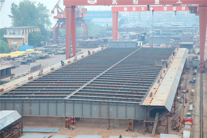 武船重工股份于2010年3月簽訂該橋建造合同,承擔(dān)了該橋鋼拱肋、橫撐、橋面格子梁、橋面板等在內(nèi)的鋼結(jié)構(gòu)加工制造、預(yù)拼裝、現(xiàn)場安裝等工作,總用鋼量1.16萬噸。