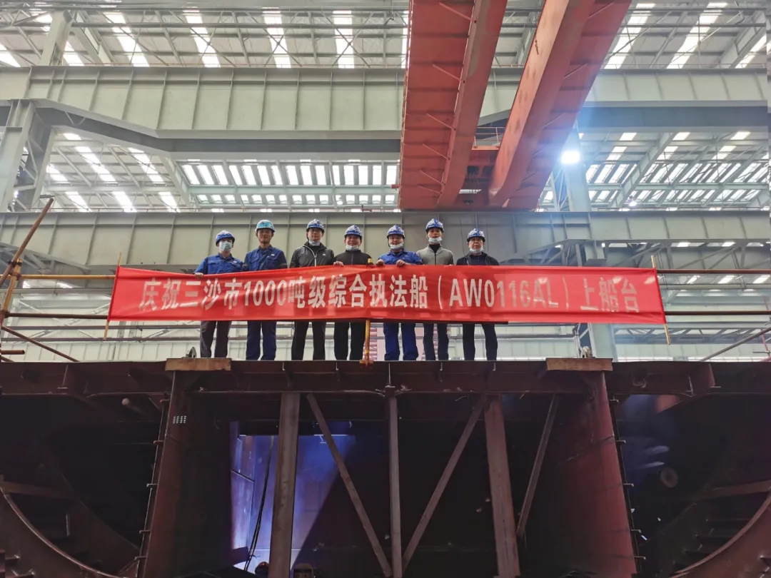 2020年10月19日,中國船舶武船集團承制的三沙市1000噸級綜合執(zhí)法船首制分段順利上船臺。