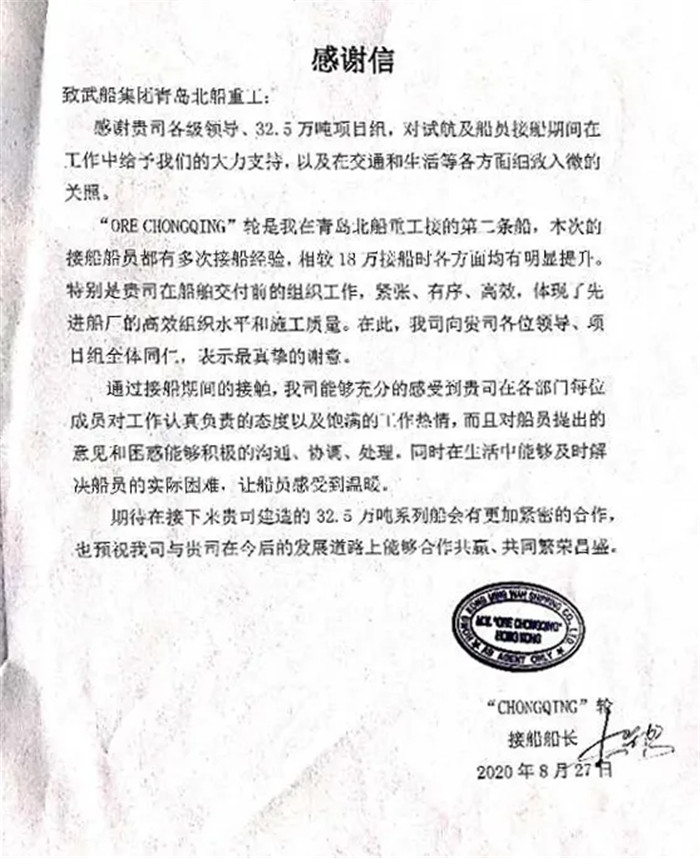 ▲“ORE CHONGQING”輪接船船長發來感謝信