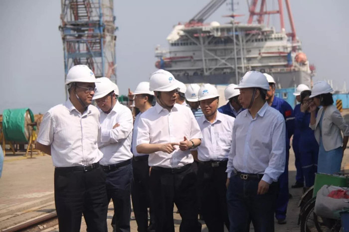李冰一行來到青島武船碼頭生產區域,實地查看了正處于系泊試驗階段的4型5艘海工產品,并現場聽取了生產建造進展情況。