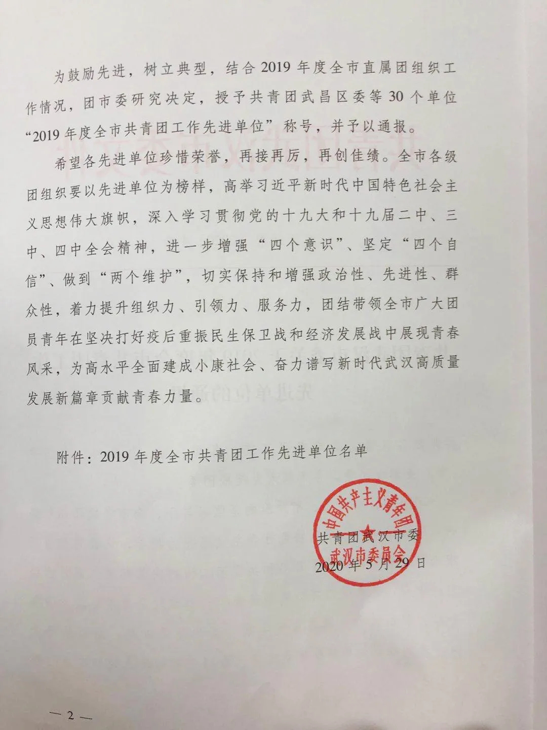 武船集團團委被授予2019年度武漢市共青團工作先進單位榮譽稱號。