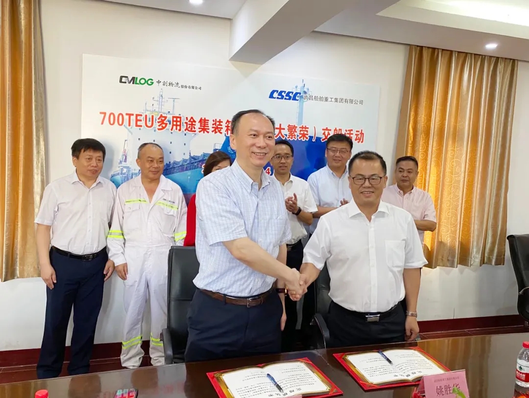 8月4日8時18分,由中國船舶武船集團為中創(chuàng)物流青島遠大均勝海運有限公司建造的700TEU多用途集裝箱首制船(遠大繁榮),在江蘇南通順利交付。中創(chuàng)物流青島遠大均勝海運有限公司董事長高兵、上海船舶研究設計院副院長周志勇、武船集團副總經(jīng)理姚勝華出席了交船活動。