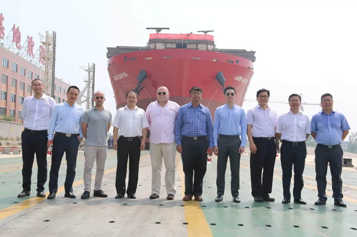 7月24日上午10時(shí)18分,烈日炎炎,彩旗飄動(dòng),由雙柳武船承建的13000DWT甲板運(yùn)輸船最后一艘4號(hào)船在雙柳基地下水。船東代表法國(guó)路易達(dá)孚海運(yùn)集團(tuán)公司艾米力?杜,武昌船舶重工集團(tuán)有限公司副總經(jīng)理田軍,武船集團(tuán)雙柳武船黨委書記、董事長(zhǎng)楊國(guó)平等參加了下水儀式。4號(hào)船的順利下水,標(biāo)志著在雙柳武船全體員工努力下,在設(shè)計(jì)師、工程師和驗(yàn)船師的積極幫助下,13000DWT項(xiàng)目進(jìn)入全面收官的關(guān)鍵沖刺階段。
