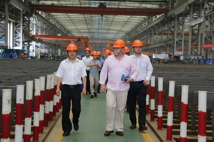 儀式后田軍帶領(lǐng)艾米力?杜等一行參觀雙柳武船分段車間