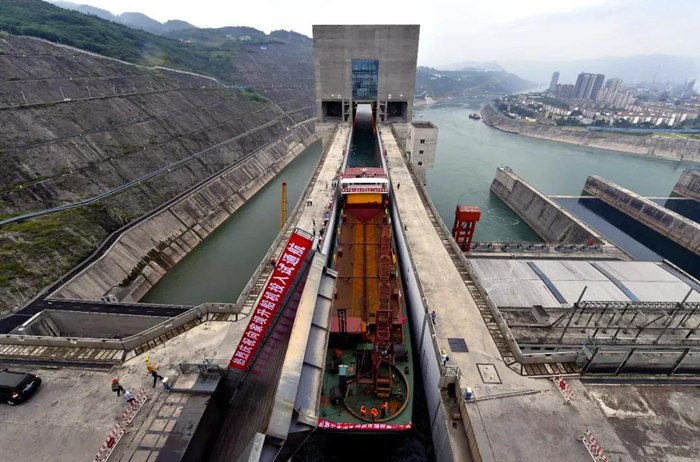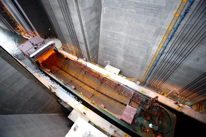 向家壩 升船機(jī)金結(jié)設(shè)備的制造、安裝、調(diào)試開始于2013年3月,歷時62個月,終于在今天成功對社會開放,開啟長江至金沙江的大門。試通航期間計劃每日通過4~8條船。這標(biāo)志著長江黃金水道向上游金沙江流域延伸了175公里,途徑四川、云南兩省的7個縣,將長江黃金水道聯(lián)通至云貴川,開啟造福云貴川之路,起到“一帶一路”造福地方的作用。