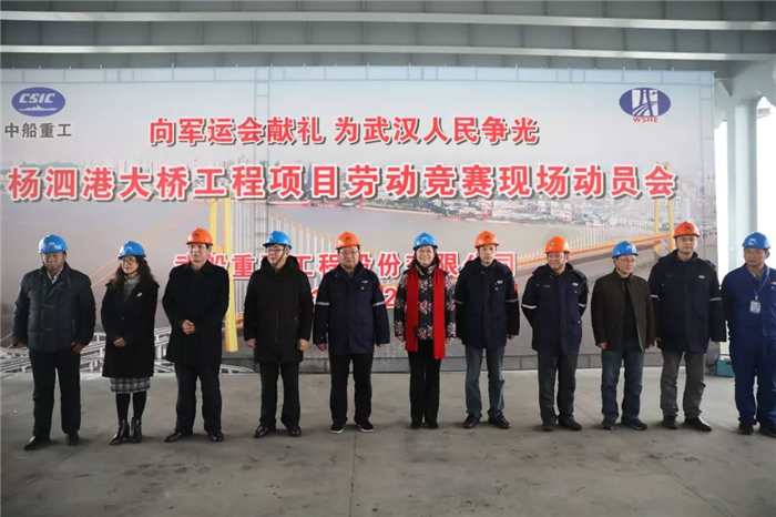 武漢市總工會黨組書記、常務副主席王芳,武船集團黨委副書記、工會主席楊少稀出席啟動儀式,并授予武船楊泗港大橋項目部“勞動競賽攻堅隊”旗幟。本次活動旨在全力推進大橋建設速度,掀起了大干快上熱潮,加快推進楊泗港大橋項目建設。