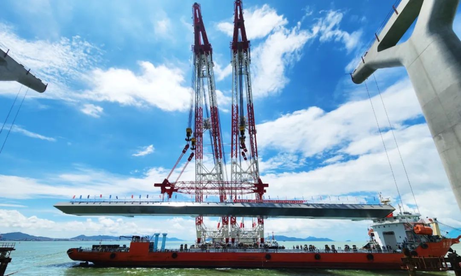 8月12日下午14時,黃茅海跨海通道中引橋施工現場,重達1340噸鋼箱梁大節段成功吊裝,標志著黃茅海跨海通道中引橋鋼箱梁大節段吊裝作業全面開始。