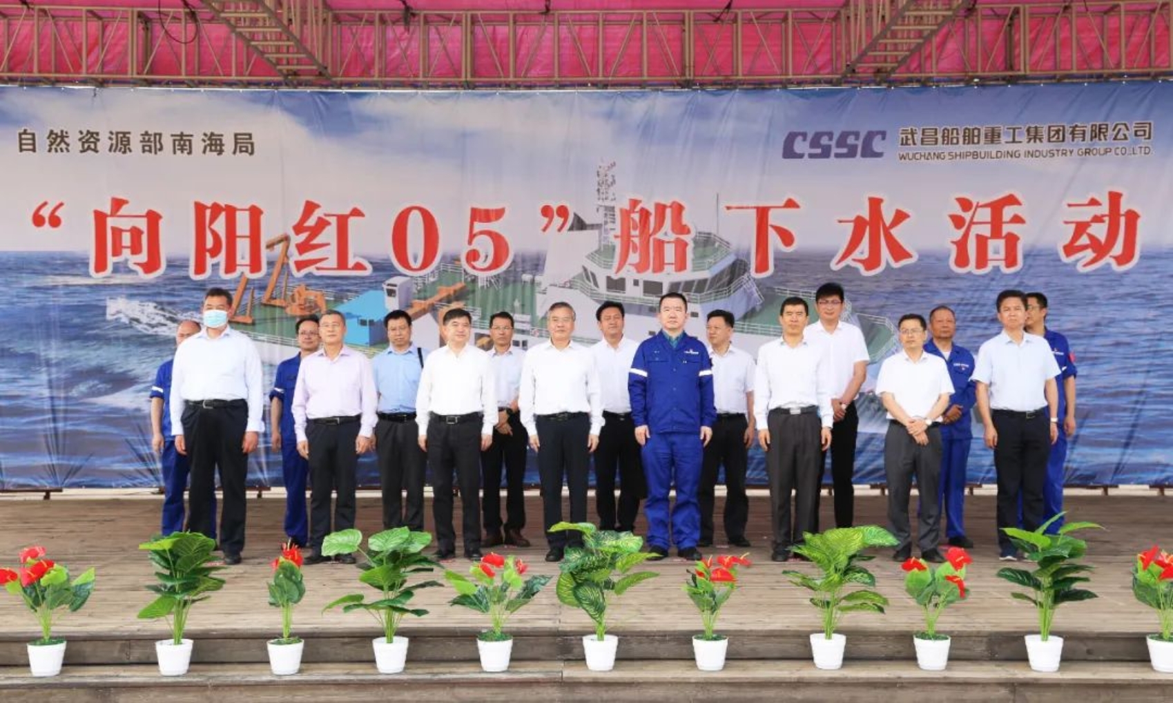 武昌造船黨委書記、董事長姜濤及自然資源部南海局分黨組書記、局長雷波,中國船級社武漢分社總經理徐立,上海佳船工程監理發展有限公司副總經理王道順,中船集團701研究所經營產業處處長馬洪濤等相關領導出席儀式并為下水儀式剪彩。