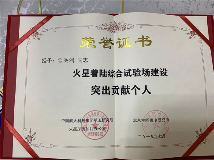 ▲武船集團重裝公司火星著陸綜合試驗場建設(shè)施工項目總指揮雷洪洲榮獲“火星著陸綜合試驗場建設(shè)突出貢獻個人”