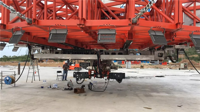 2019年7月初,“隨動盤”在武船集團重裝公司廟山基地順利完成組裝及檢測實驗,并立即拆分裝箱發(fā)往懷來。“隨動盤”上安裝的導軌平面度公差達到0.1mm、平行度公差達到0.15mm ,各項檢測數(shù)據(jù)滿足工藝精度及試驗要求。