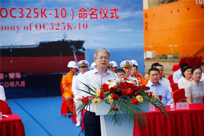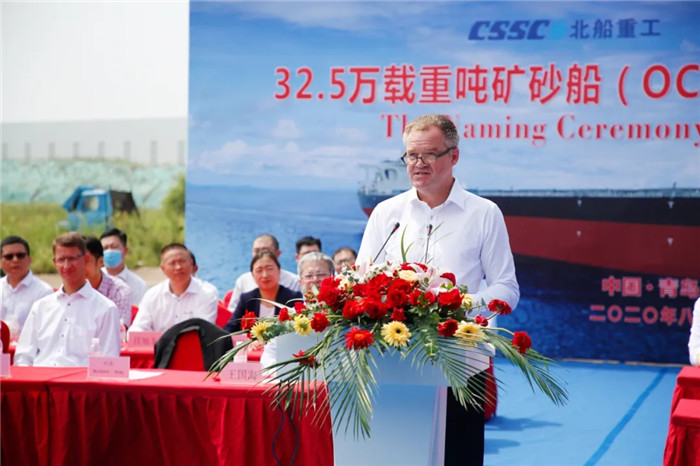 儀式現(xiàn)場由北船重工副總經(jīng)理鮑會勇主持命名暨交船儀式,北船重工總經(jīng)理谷克超、上海船舶研究設(shè)計(jì)院黨委書記王麟、中國船級社青島分社總經(jīng)理朱永實(shí)、勞氏船級社全球首席運(yùn)營官M(fèi)ark Darley、香港明華船務(wù)有限公司副總經(jīng)理李霖、工銀租賃航運(yùn)金融事業(yè)部執(zhí)行總經(jīng)理郭芳萌先后致辭,工銀租賃項(xiàng)目與投資審批部副總經(jīng)理高潔將本船命名為“ORE CHONGQING”并為其砍纜。