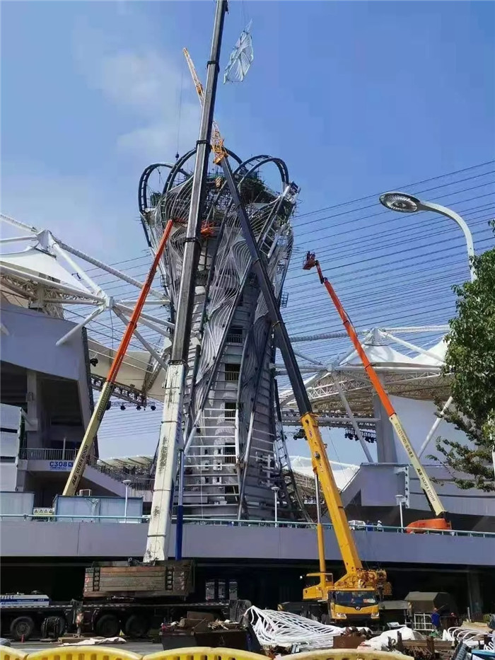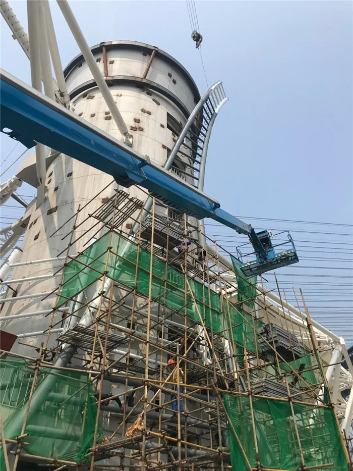 九層樓高的火炬塔,改造后約為46米。為了順利實(shí)現(xiàn)高空安裝、吊裝、焊接等作業(yè)的迅速、有效鋪開(kāi),吳剛將和楊華千方百計(jì)協(xié)調(diào)來(lái)58米的高空作業(yè)車(chē)和具備550噸起吊能力且伸展臂長(zhǎng)達(dá)到78米的起重機(jī)車(chē)配合作業(yè)。