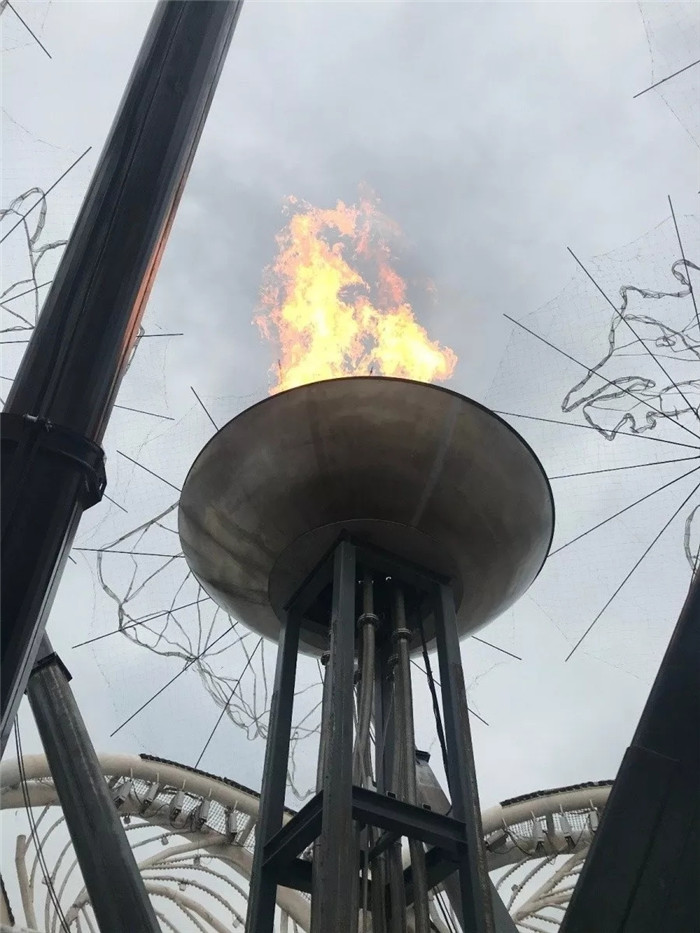 第一步,火炬手點(diǎn)燃同心雙層管道內(nèi)垂直向上噴出的天然氣(中心管道噴出水柱,外層管道噴出天然氣),令我們欣賞到“水火交融”的“奇景”;