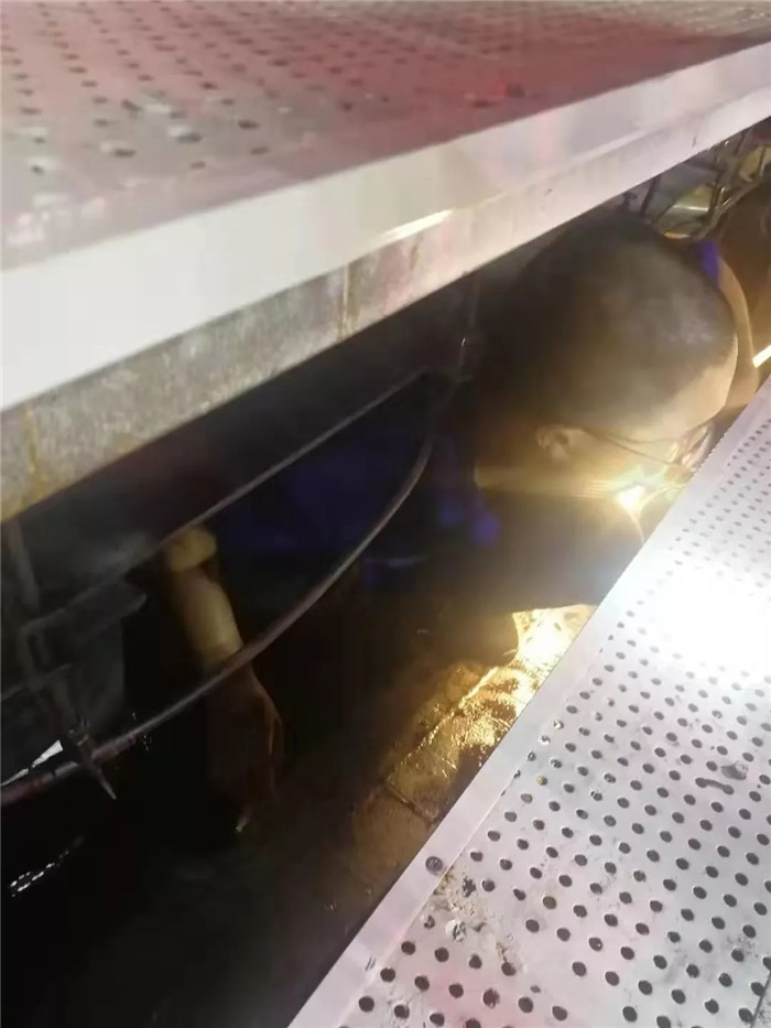 ▲水區(qū)下方施工結(jié)束后鉆出來(lái)一身汗水一身銹跡