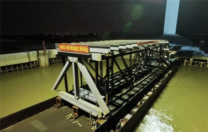 ▲白洋長江大橋主橋首個(gè)鋼桁梁節(jié)段裝船發(fā)運(yùn)