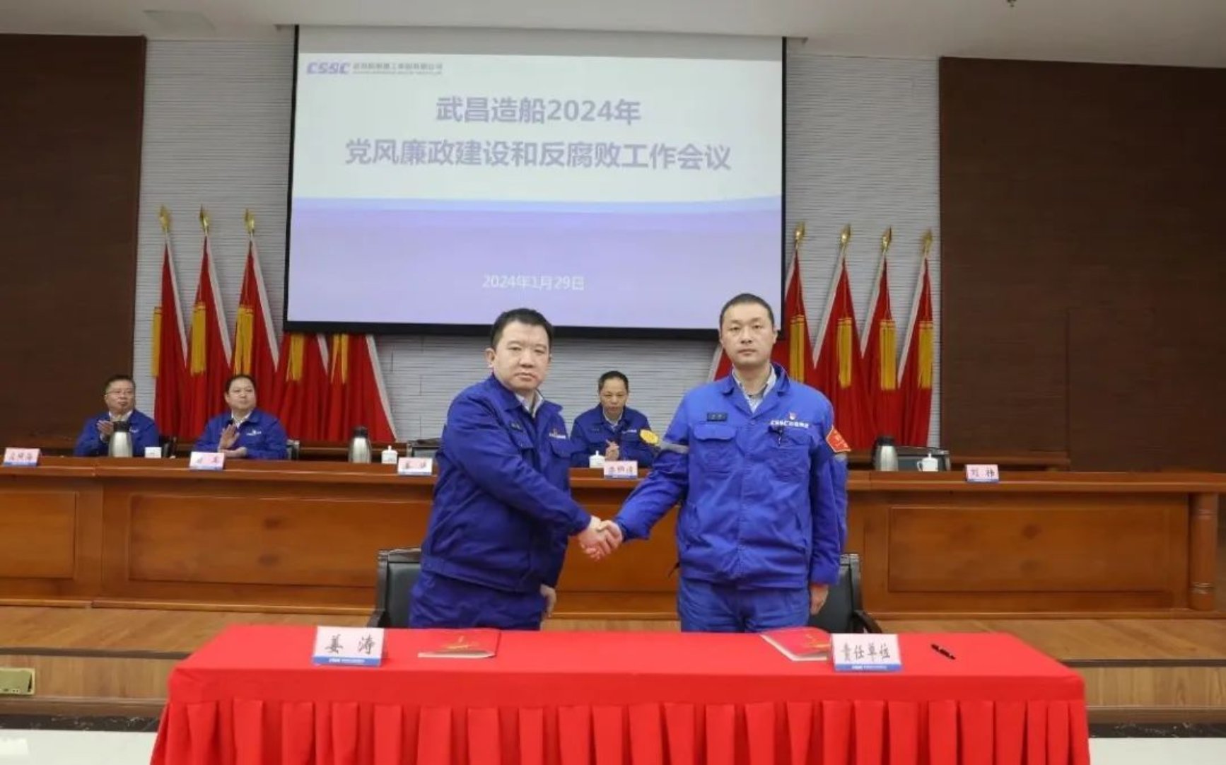 1月29日,中國船舶集團武昌造船召開2024年黨風廉政建設和反腐敗工作會議。武昌造船黨委書記、董事長姜濤出席會議并講話。黨委副書記、總經理梁師清主持會議,并傳達了二十屆中央紀委三次全會精神和集團公司2024年黨風廉政建設和反腐敗工作會議暨警示教育大會精神。黨委委員、紀委書記左照海作了題為《忠誠履職 擔當作為 以紀檢工作新質效助推價值創造 為公司改革深化提升 高質量發展提供堅強保障》的工作報告。公司領導田軍、陳仲明、劉祎,公司助理級領導、公司紀委委員,中層副職及以上管理人員參加會議。