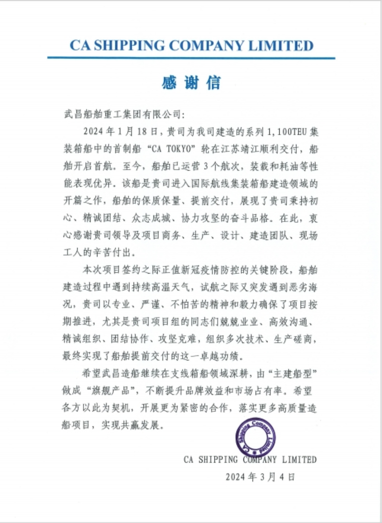 “1月18日,貴司為我司建造的系列1100TEU集裝箱船中的首制船“CA TOKYO”輪在江蘇靖江順利交付,船舶開啟首航。至今,船舶已運(yùn)營3個航次,裝載和耗油等性能表現(xiàn)優(yōu)異。”——CA SHIPPING COMPANY LIMITED