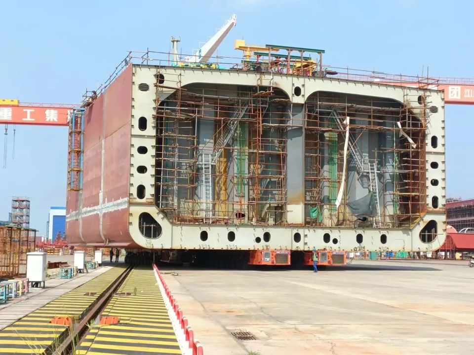 6月14日,該船一號環段總組順利轉運;6月29日,二號環段總組順利轉運,7月6日,三號環段總組順利轉運……一個月內,快速精準形成2號船主船體,船臺周期相較一號船進一步縮短2個月。