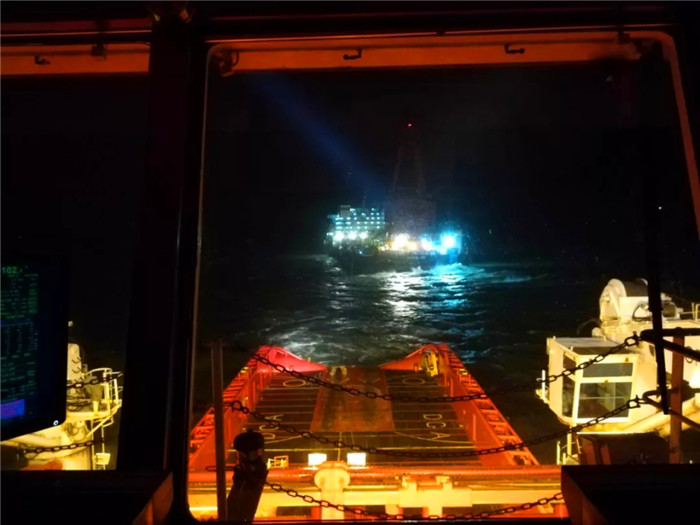 9月17日零時,“華虎”輪完成接拖全部準備工作,而后撇纜、連接小絞車鋼絲,緊接著“海洋石油202”輪錨纜上甲板、連接錨纜和拖帶鋼纜、錨纜外放110米....引纜傳遞成功、絞車鋼絲傳遞成功、拖纜連接成功、纜車長度調(diào)整到位,各項工作就緒,“華虎”輪開始向外移動!由于“海洋石油202”輪是右船艏觸礁,在當時的情況下只能橫向或者往左后牽引,近乎于橫風拖帶!橫風拖帶不僅難度非常大,只要一不留神操作不當或船舶性能失衡,“華虎”輪隨時會面臨失位風險!風小時,抓緊時機側(cè)面受風往外拉,風大時,立即調(diào)整自身船態(tài)。“華虎”輪就這樣在波濤洶涌的海浪中與“山竹”周旋著,經(jīng)過3個小時的鏖戰(zhàn),“海洋石油202”輪成功脫淺!單根鋼纜拖帶,穿越一方航道,避開航道燈標和幾條拋錨船,又經(jīng)過2個多小時,“海洋石油202”輪在“華虎”輪的牽引下安全抵達錨地拋錨!