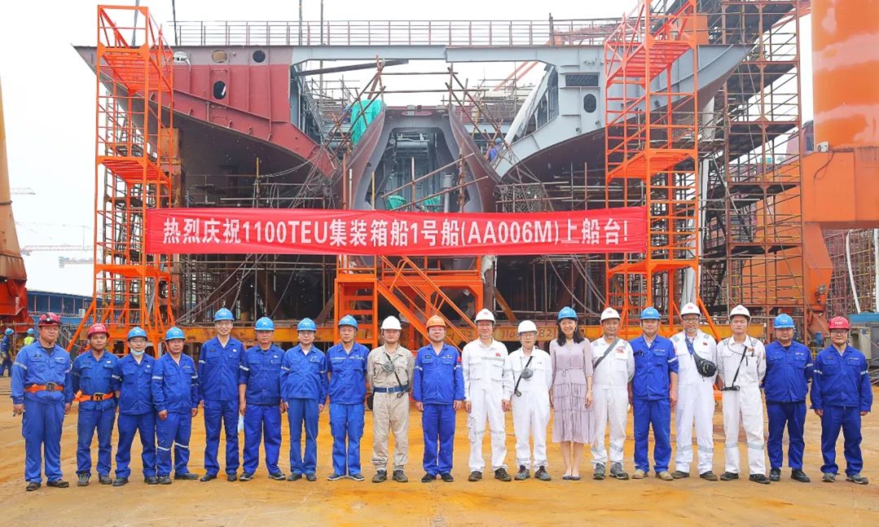 5月17日11時(shí)18分,武昌造船為希臘船東Cosmoship建造的1100TEU集裝箱船首制船在雙柳廠區(qū)順利開工。船東代表、BV船級(jí)社、中船貿(mào)易相關(guān)領(lǐng)導(dǎo)及公司相關(guān)部門代表、產(chǎn)品三總師參加開工儀式。