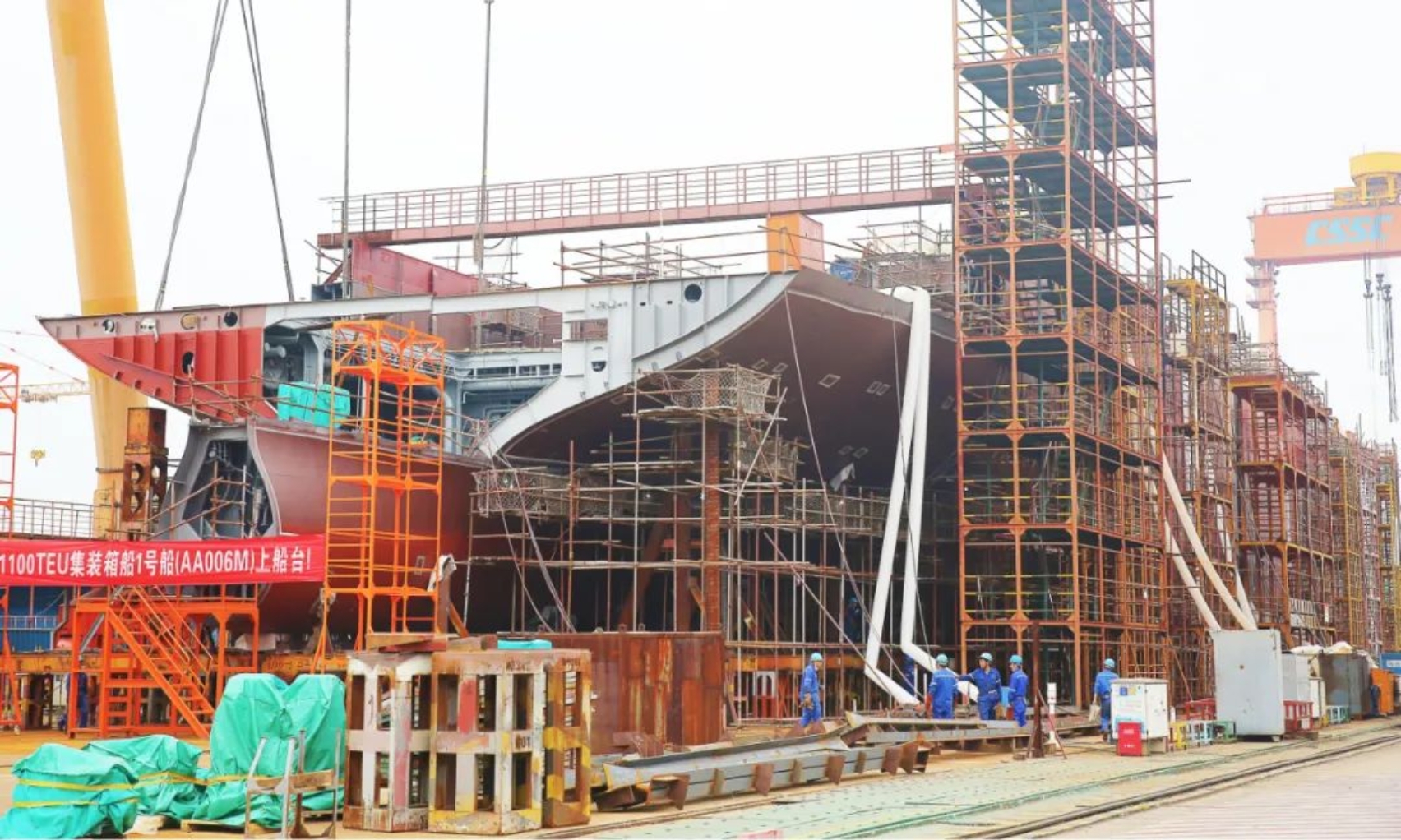 5月16日上午11時(shí)18分,武昌造船為CA Shipping建造的1100TEU集裝箱1號(hào)船在雙柳廠區(qū)順利上船臺(tái),在船舶完整性良好的前提下實(shí)現(xiàn)計(jì)劃節(jié)點(diǎn)提前9天完成。