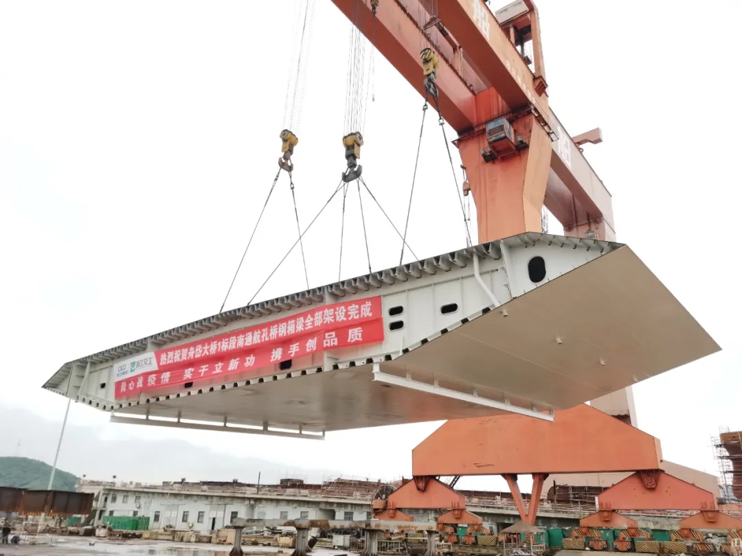 復工后,武船重工股份堅持疫情防控和復工復產兩手抓,開展勞動競賽,在保證質量和安全的前提下,加快生產進度,最終在三個鋼結構標段中拔得頭籌,在臺風來臨前完成了全部節段的吊裝,降低了橋位施工風險。
